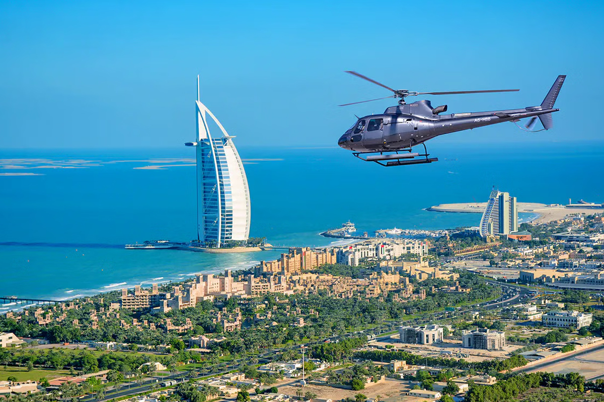 Witness Dubai's breathtaking skyline from above, soaring over the Palm Jumeirah, Burj Khalifa, and the glittering Dubai Marina.